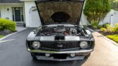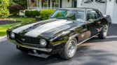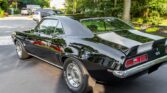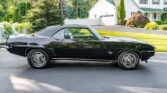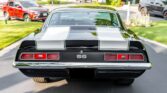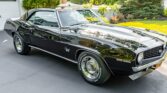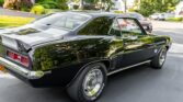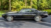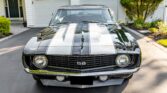 This 1969 Camaro RS/SS boasts a powerful 396 V8 engine with 350HP, paired with a four-speed manual transmission and Hurst shifter. With just 18,000 miles (TMU), it features striking black paint with white stripes, black vinyl interior, and classic SS grille, badges, and spoilers. Upgrades include an Edelbrock intake manifold, power steering, front disc brakes, and a retro-style AM/FM/cassette stereo.
