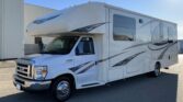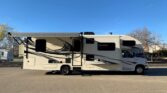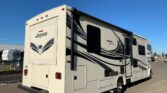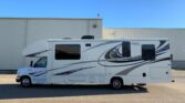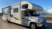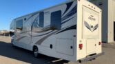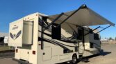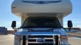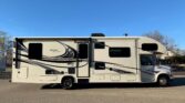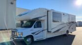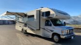 Stepping inside the Greyhawk 29ME class C gas motor home by Jayco you will notice how open the motor home feels with dual opposing slides in the living space, and a rear bedroom slide, plus much more! To the right of the entrance there is a slide with a refrigerator and a hide-a-bed sofa. On the opposite side of the motor home there is another slide with a booth dinette, three burner range, and microwave. Next to the slide there is a double kitchen sink and extra counter space along the interior wall.Above the cab there is a bunk as well as a TV, or you can choose to have an optional entertainment center.Towards the rear of the motor home, the bathroom is on the right. Inside the bathroom there is a sink, toilet, linen cabinet which can hold towels or toiletries, and a shower. Across from the bathroom there is a large wardrobe and an additional linen cabinet which offers extra storage.In the rear bedroom you will find a large dresser along the road side, a queen bed slide in the rear, and chest.There are plenty of overhead cabinet throughout the motor home as well as exterior storage compartments. If you would like some shade outside, then under the 14′ awning will become your favorite outdoor space.