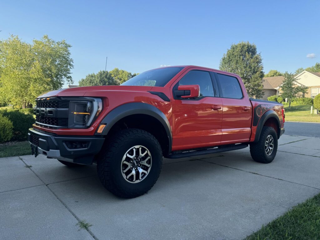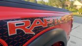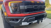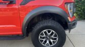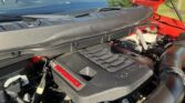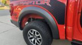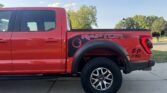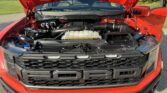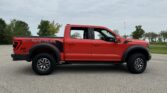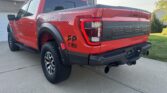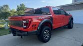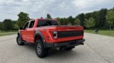 This 2021 Ford F-150 Raptor SuperCrew is finished in Code Orange Metallic over Black Nirvana upholstery and is powered by a twin-turbocharged 3.5-liter V6 linked with a 10-speed automatic transmission, a dual-range transfer case, a Torsen limited-slip front differential, and an electronically locking rear differential. Equipment includes the Convenience, Exterior Graphics, 360-Degree Camera, and Tow Technology packages as well as Fox live-valve shocks, 17″ cast-aluminum wheels, heated and ventilated power front seats, and an 18-speaker Bang & Olufsen sound system. The Raptor features a wider track than the standard F-150 and is equipped with a model-specific bed, grille, bumpers, and running boards. This example is finished in Code Orange Metallic with black Raptor graphics and features automatic LED headlights, Rigid LED fog lights, side mirror lighting, a tonneau cover, cargo bed lighting, dual exhaust outlets, front and rear recovery hooks, and a receiver hitch.