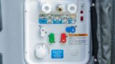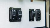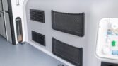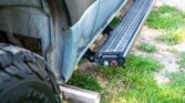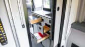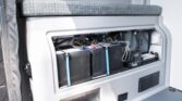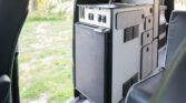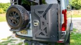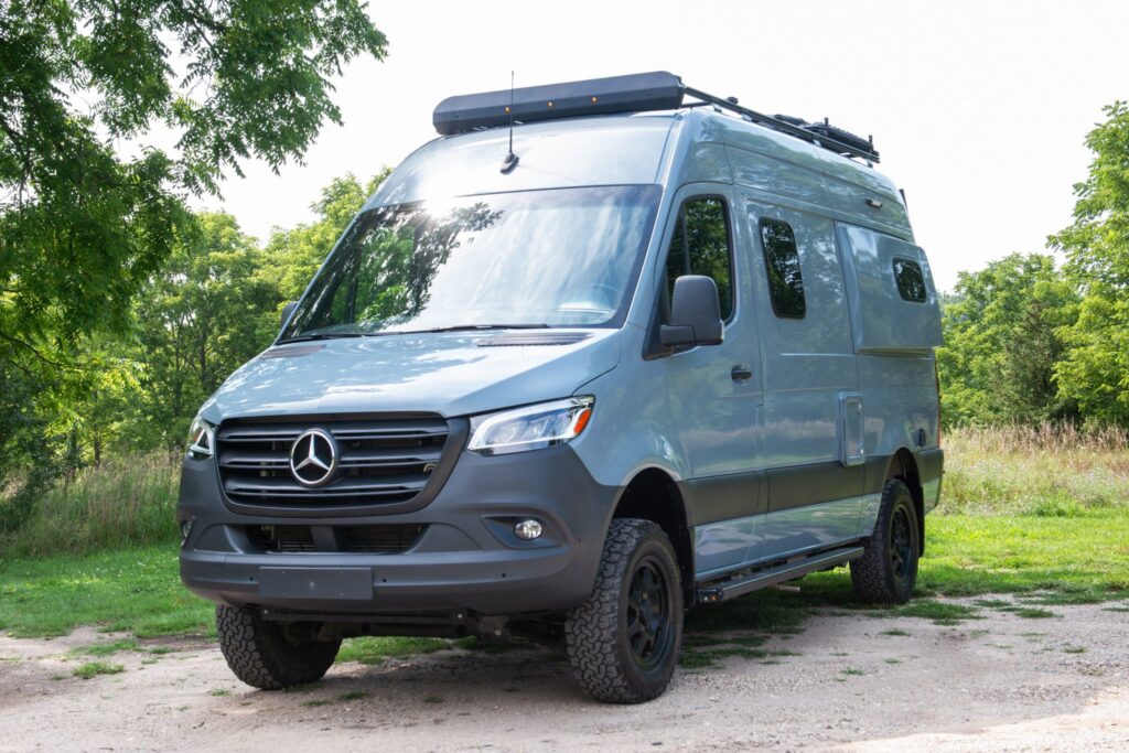 The van is finished in Blue Grey over black vinyl upholstery and powered by a 3.0-liter turbodiesel V6 mated to a seven-speed automatic transmission and a dual-range transfer case. Features include swiveling front seats, a touchscreen infotainment system, a sleeping surface with a power-operated lift, a kitchenette, a wet bath, privacy shades, and a workspace with a removable table. Additional equipment includes 17″ Method alloy wheels, LED perimeter lighting, roof-mounted solar panels, and a power-operated awning as well as an Owl Vans rear ladder, equipment box, and tire carrier. This Winnebago Revel 4×4. The extended-height body is finished in Blue Grey with black trim and bumpers. The van is equipped with a sliding side door, rear barn doors, a power-operated awning, a roof rack, rooftop solar panels, running boards, and LED perimeter lighting. Owl Vans accessories include an aluminum cargo box, a bike rack, and a rear ladder with an integrated tire carrier, while additional equipment consists of Maxtrax traction boards, a receiver hitch, and connections for water, shore power, and gray water disposal. Black-finished 17″ Method alloy wheels are wrapped in 245/70 BFGoodrich All-Terrain T/A Tires, while a matching spare is secured to the rear carrier. Stopping power is provided by four-wheel disc brakes.
